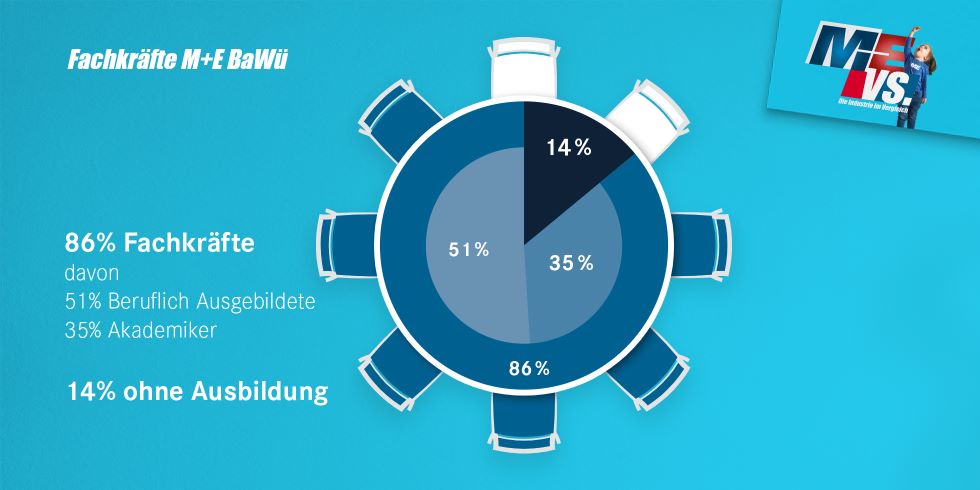 In der M+E-Industrie sind landesweit rund 35 Prozent der Beschäftigten akademisch ausgebildete Fachkräfte, darunter 19 Prozent Spezialisten. 51 Prozent sind beruflich ausgebildete Fachkräfte. Das macht in Summe 86 Prozent!