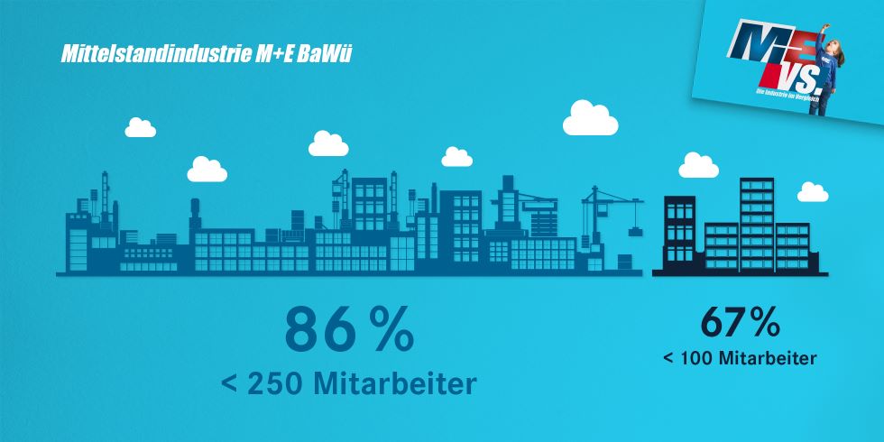 Die Metall- und Elektro-Industrie in Baden-Württemberg ist in ihrem Kern eine mittelständische Industrie: 67 Prozent der Betriebe haben weniger als 100 Mitarbeiter. Und 86 Prozent der Unternehmen haben weniger als 250 Mitarbeiter.