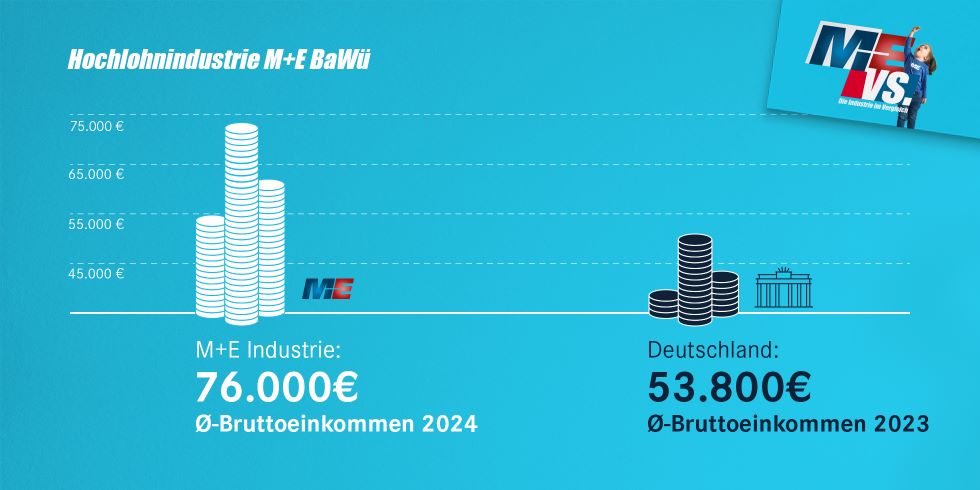 Gut 76.000 Euro beträgt 2024 das durchschnittliche Jahresbruttoeinkommen in der Metall- und Elektroindustrie Baden-Württembergs. Damit gehören unsere Mitarbeiter zu den bestbezahlten Industriefachkräften der Welt. Wäre die M+E-Industrie ein eigener Staat, so hätte sie ein höheres Pro-Kopf-Einkommen als die USA und fast alle EU-Mitgliedsländer.