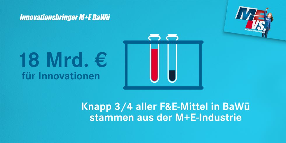 Diesen Betrag haben die Unternehmen der baden-württembergischen Metall- und Elektroindustrie im Jahr 2021 in die Forschung und Entwicklung neuer Materialien, Produkte, Prozesse und Dienstleistungen investiert. Forschungsausgaben sind ein gutes Barometer, um die Innovationsfreudigkeit einer Branche einzuschätzen. Und hier steht M+E einsam an der Spitze: Knapp drei Viertel aller F&E-Mittel der baden-württembergischen Wirtschaft stammen von M+E-Betrieben.