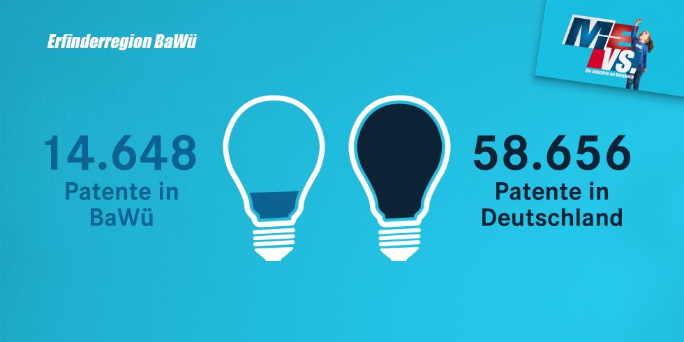 14.648 Patente haben Unternehmen und Bürger in Baden-Württemberg 2021 angemeldet. Das sind 130 je 100.000 Einwohner – mehr als doppelt so viele wie im Deutschlandschnitt. Damit ist Baden-Württemberg das innovativste Bundesland. Ein Großteil der Ideen ist den Mitarbeitern der baden-württembergischen Metall- und Elektroindustrie zuzurechnen. Alleine Bosch, der bundesweite Spitzenreiter, kam 2023 laut Deutschem Patent- und Markenamt auf 4.160 Anmeldungen, gefolgt von der Mercedes-Benz Group mit 2.046 Patenten. Mit ZF landete ein weiteres Unternehmen aus der baden-württembergischen M+E-Industrie unter den Top Fünf.