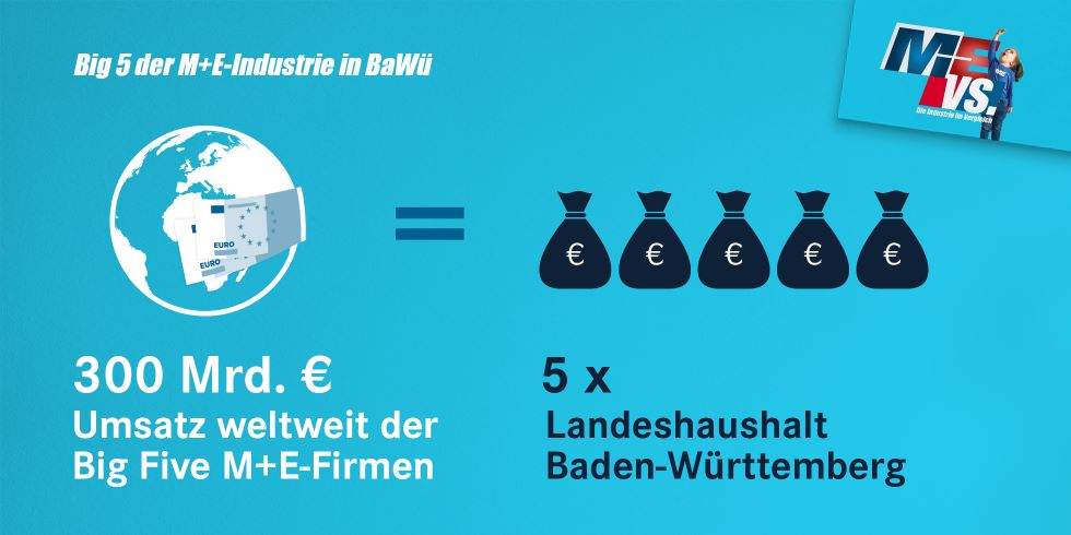 Die fünf größten M+E Betriebe aus Baden-Württemberg erwirtschaften weltweit jährlich gemeinsam weit über 300 Milliarden Euro Umsatz – das ist rund fünf Mal so viel wie der Landeshaushalt von Baden-Württemberg. In diesen Firmen arbeiten weltweit knapp eine Million Menschen.
