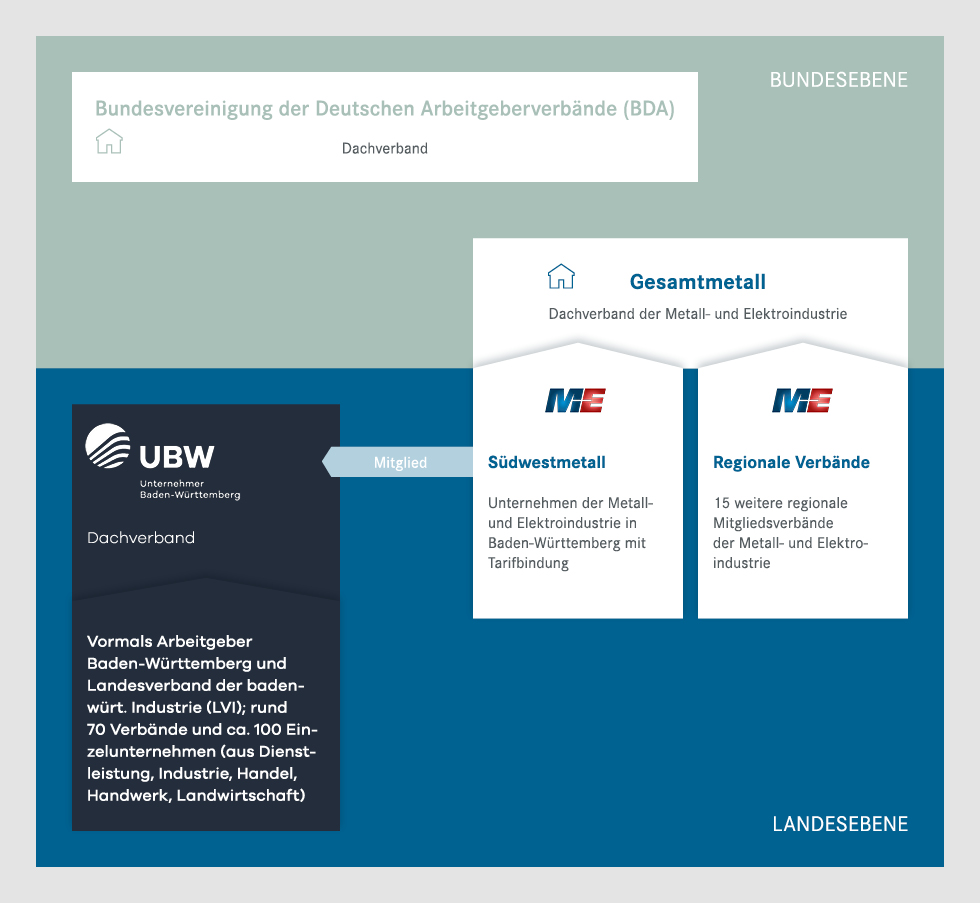 Nun zur Struktur: Bei Südwestmetall sind rund 680 Unternehmen Mitglied (Stand: Ende 2023). Südwestmetall selbst ist wiederum Mitglied der Unternehmer Baden-Württemberg (UBW), die 2021 aus dem Zusammenschluss der beiden Landesdachorganisationen der Industrie und der Arbeitgeber, LVI und Arbeitgeber Baden-Württemberg, entstanden sind. Und die UBW fungieren auch weiterhin als Dachverband der Arbeitgeberverbände unterschiedlicher Branchen auf Landesebene.